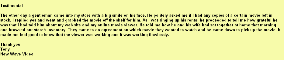"I have had great comments from my customers indicating that the movie viewer is incredible.. and that it's better than Blockbuster. They get to see the trailer and can decide if they want to take the movie home." Nickie Savage Muskoka Star Entertainment