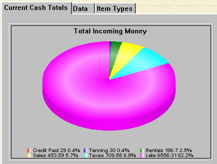 Here is a graph from the Daily Cash File. The money in is split into six main categories: Money paid on account, sales, tanning, taxes, rentals, and late charges.