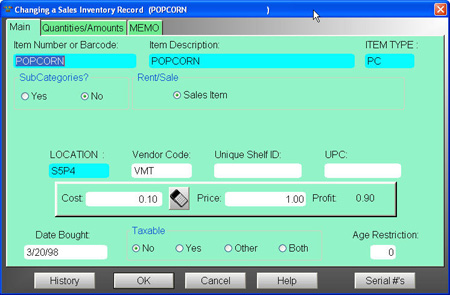 The sales inventory form lets you add sales items. From the rental/pos screen, you can sell just like you rent, by typing in the item number or scanning the number. The program knows ahead of time if it is a sale item or a rental item. You can also transfer a rental item to a sales item on the fly during a transaction.
